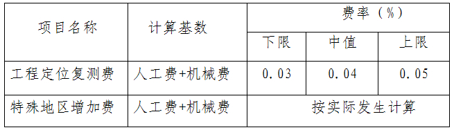 2、工程定位復(fù)測費(fèi)和特殊地區(qū)增加費(fèi)的費(fèi)率計(jì)算如下表: